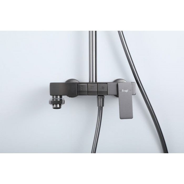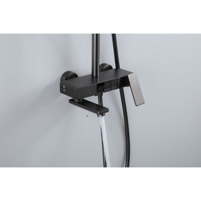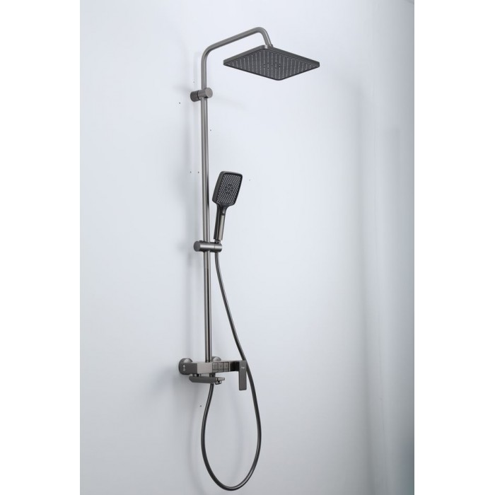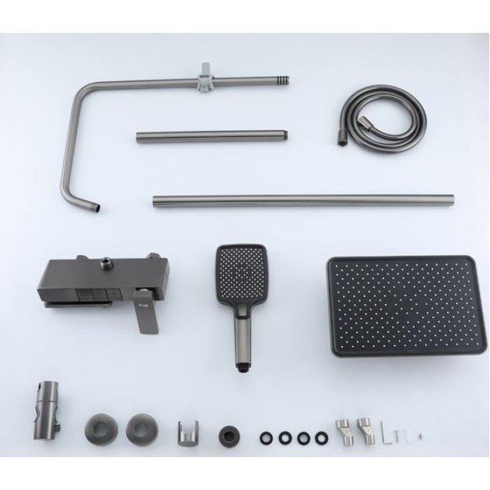В комплекте входит верхний душ, шланг, лейка, штанга с держателем для душевой лейки и смеситель.