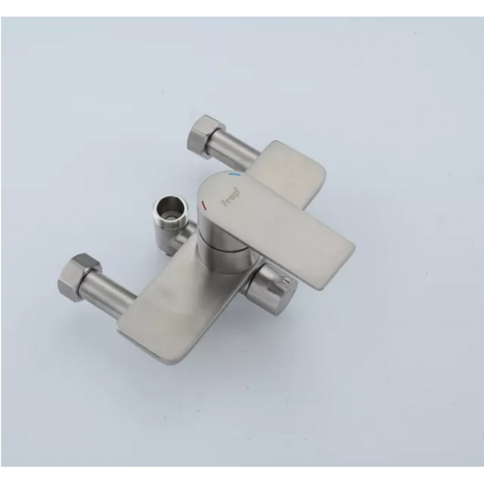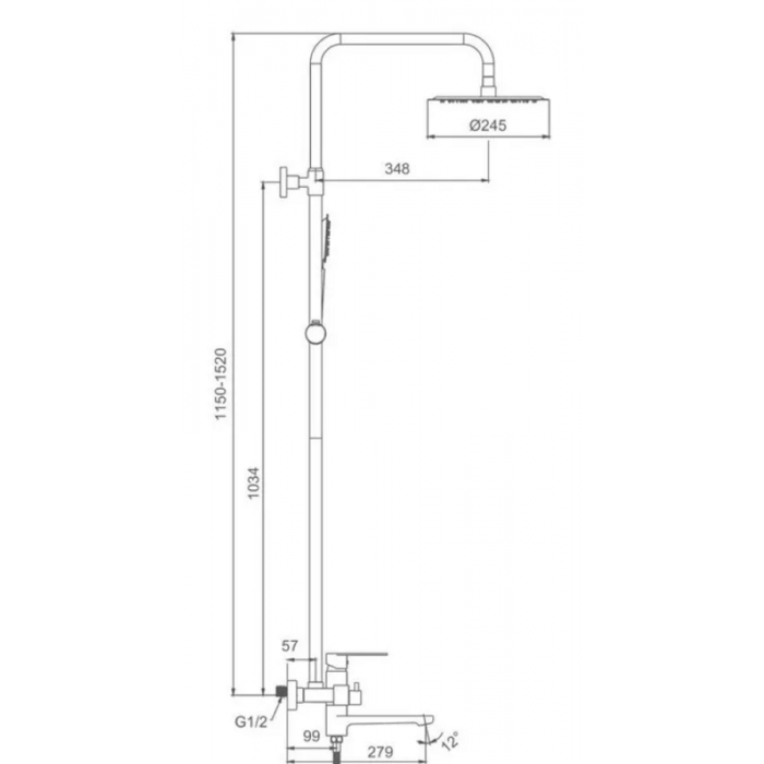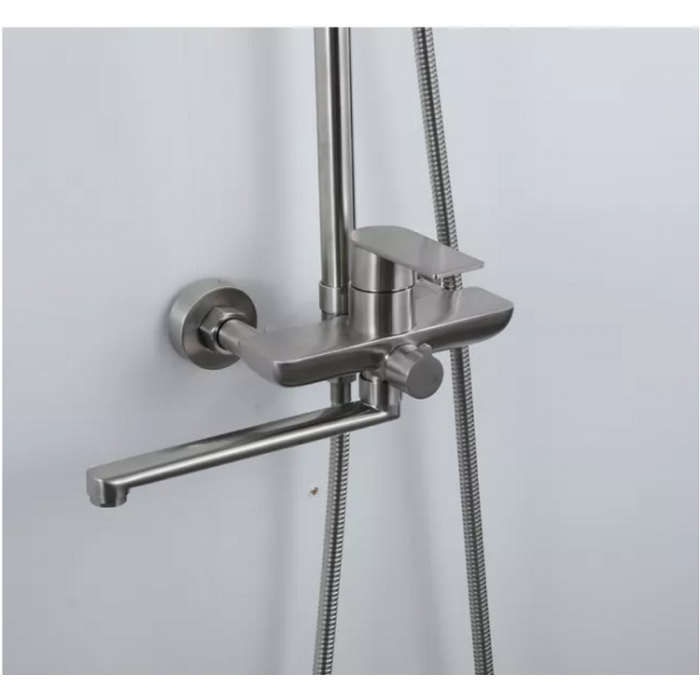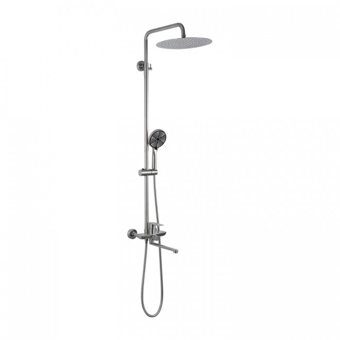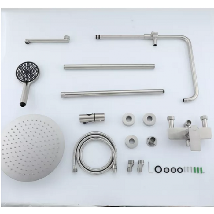 Комплектация - смеситель, душевая стойка, верхний душ, душевая лейка, душевой шланг, держатель для душевой лейки, настенный держатель, отражатели, эксцентрики