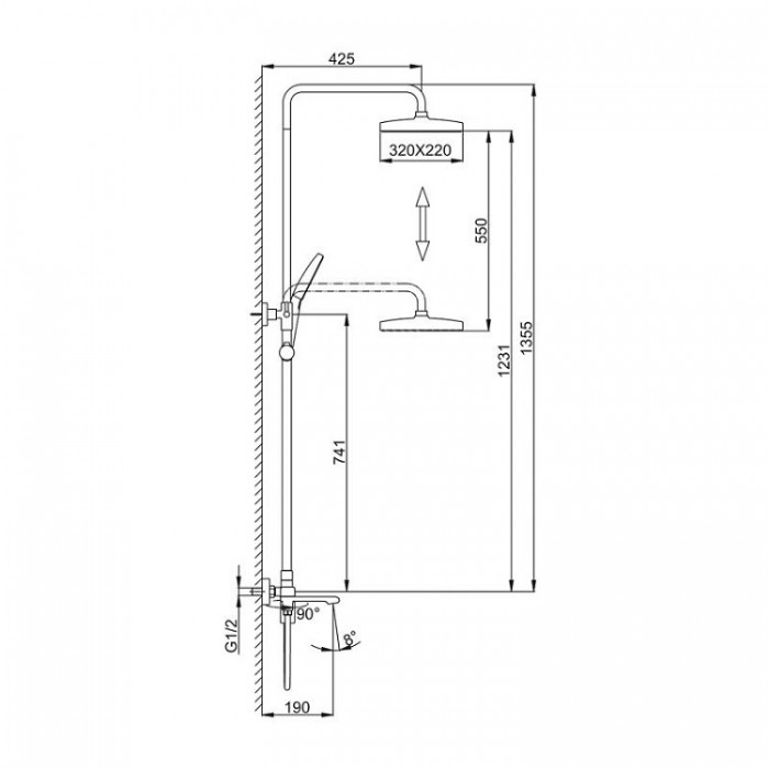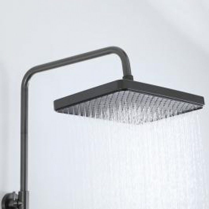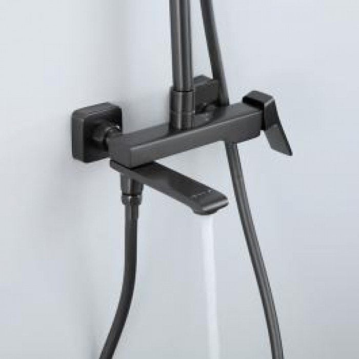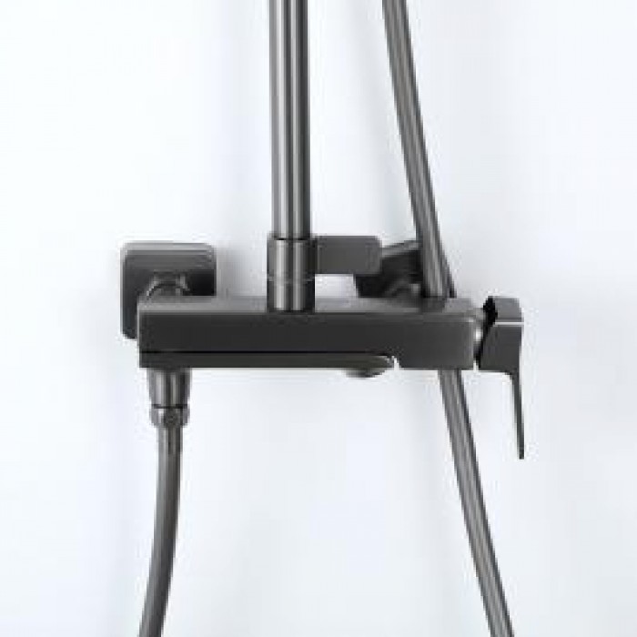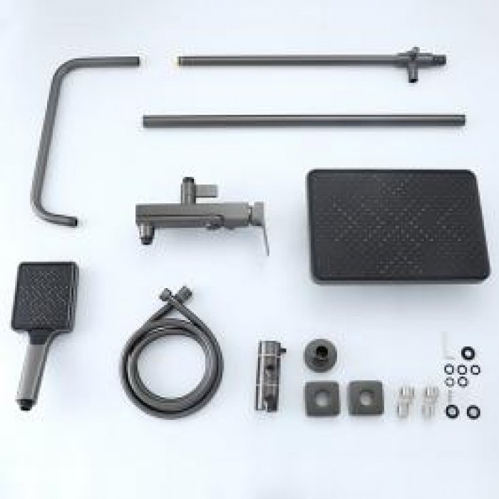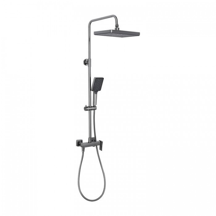 В комплекте входит верхний душ, шланг, лейка, штанга с держателем для душевой лейки и смеситель.