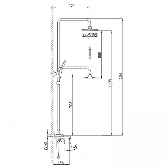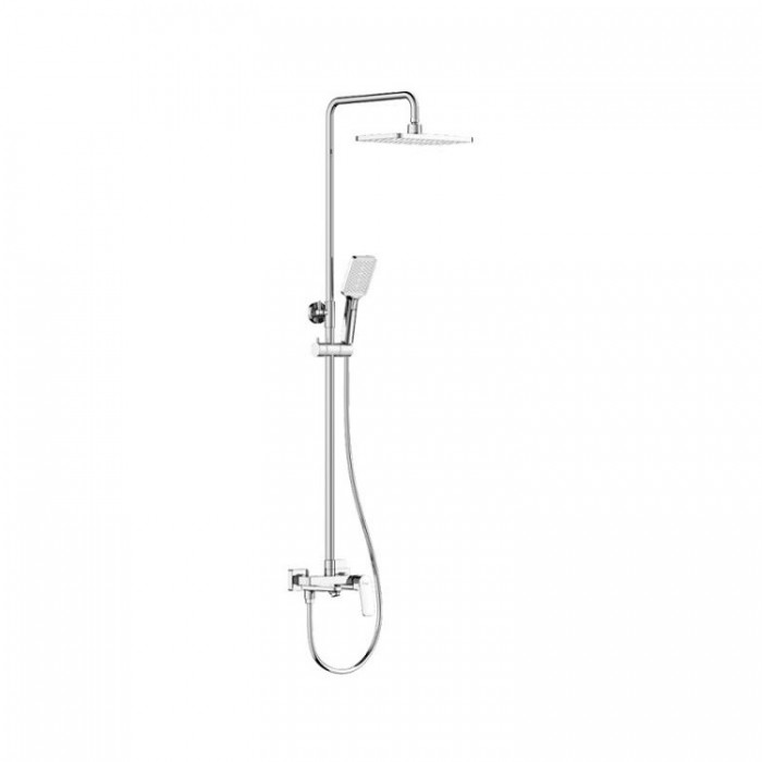 Комплектация - смеситель, душевая стойка, верхний душ, душевая лейка, душевой шланг, держатель для душевой лейки, настенный держатель, отражатели, эксцентрики, переключатель потоков