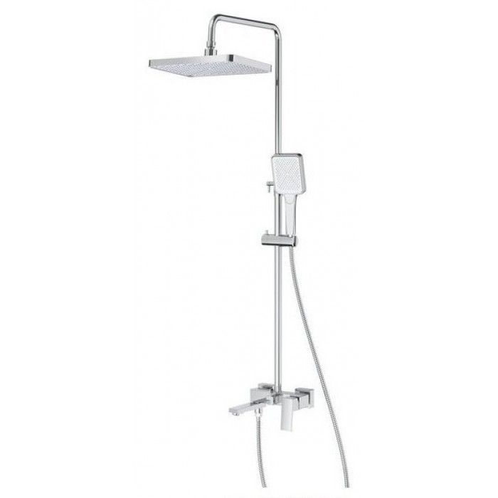 Состав комплекта - с душевой лейкой, с шлангом для душа, верхний душ, душевая стойка, излив, с настенным держателем, смеситель
